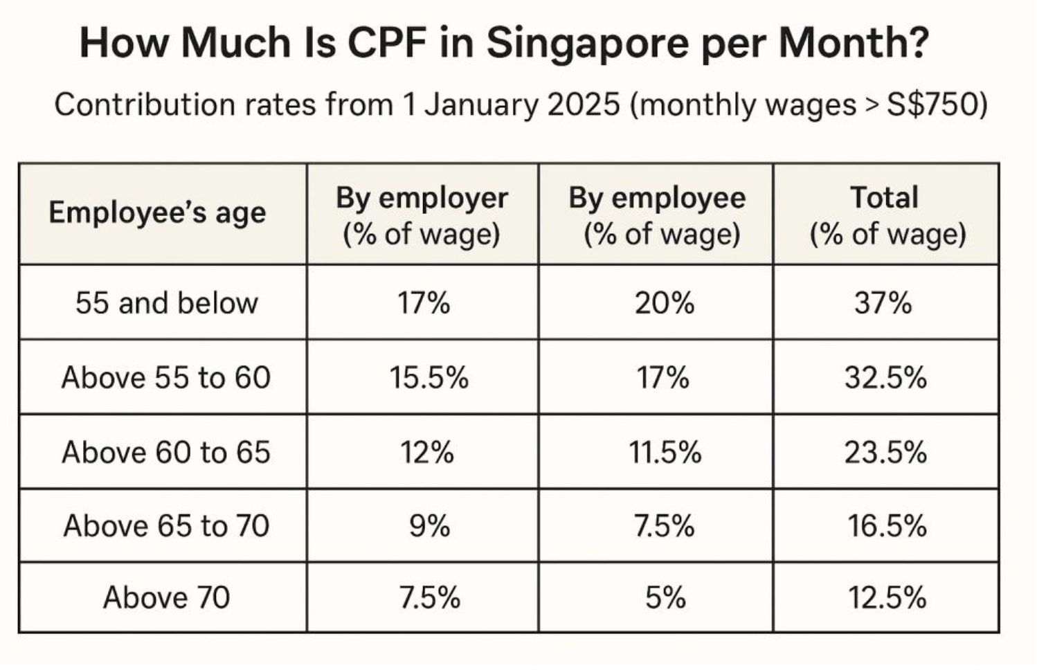 For eligible employees earning more than S$750 per month, CPF contributions range from 12.5% to 37% of monthly wages, split between employer and employee.