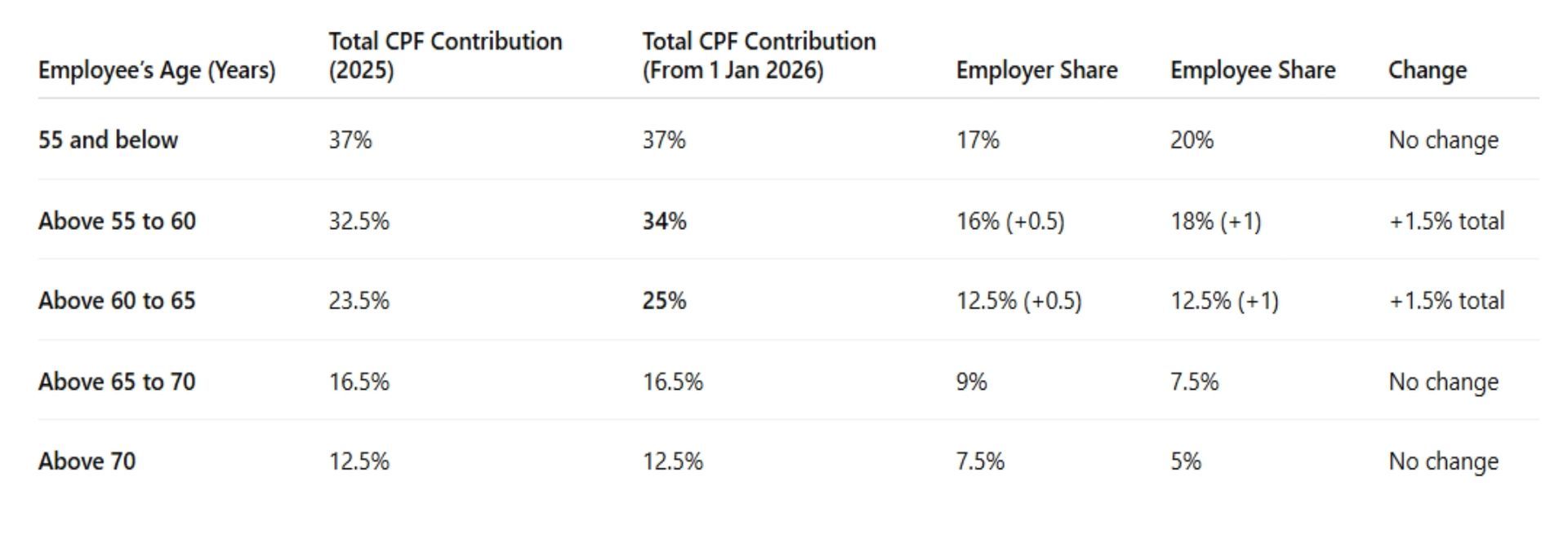 From 1 January 2026, the CPF contribution rates for employees aged between 55 to 65 will increase again to further boost retirement savings for senior workers.