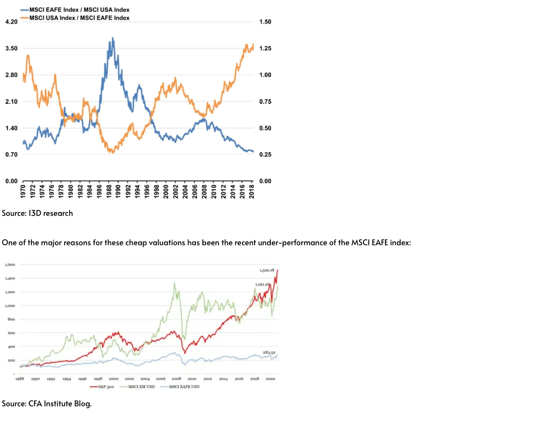 The MSCI EAFE index looks undervalued at this conjure, and the S&P500 has been one of the best performing indexes in the world. As the graph below shows, the MSCI USA Index (which is correlated to the S&P500) looks more overvalued on a price:earnings basis. Or to put it in simple terms, you are currently paying more for US stocks than international ones, for each USD, Pound or Euro in revenues. That doesn’t mean that you will make more money in the EAFE account compared to the S&P500, but it does increase the likelihood in the next decade.