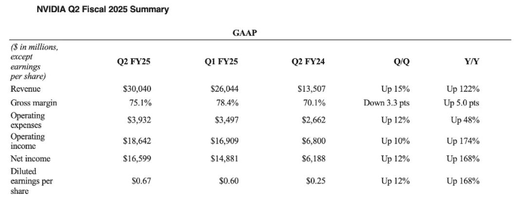 New Following the first quarter, the senior leadership team at Nvidia anticipated a Q2 revenue of $28 billion; however, they exceeded expectations by delivering $30 billion for the second quarter, reflecting a remarkable 122% growth compared to the previous year. The Gross Profit Margin stood at 75.1%, aligning with the anticipated range for Q2. One notable aspect was Nvidia's operating income, which reached $18.6 billion, reflecting a remarkable 174% increase. By calculating the ratio of Nvidia's operating income to its revenue, we can see that the company is achieving approximately 66% operating profit margins. Nvidia's operating revenue not only ranks among the industry's elite, but it also leads the pack. Both their revenue and operating income are experiencing remarkable growth of 100%. The Q2 results indicate that Nvidia is excelling across the board, with revenue, profits, and cash flow all on the rise. This performance resulted in an improved Q3 forecast of $32 billion, so what accounts for the decline in stock price despite the better-than-anticipated results?
